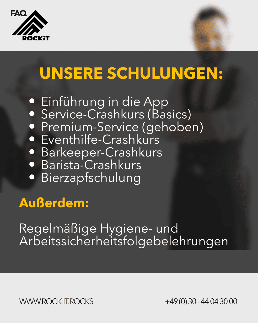 Perfekt für neue ROCKiTS oder um Dein Wissen aufzufrischen. Einige Schulungen z.B der Eventhilfe-Crashkurs ist verpflichtend, da Du als Eventhelfer über Arbeitssicherheit Bescheid wissen musst.